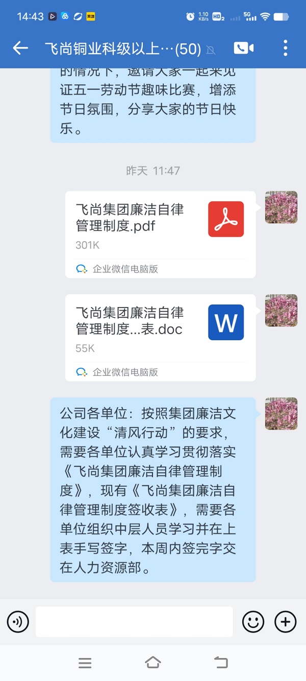 《飛尚集團廉潔自律管理制度》發(fā)布后,各成員企業(yè)相繼出臺本企業(yè)廉潔自律管理制度和各項管理規(guī)定,并通過微信工作群廣泛宣傳,不斷健全員工參與機制,充分發(fā)揮員工的積極性、創(chuàng)造性,夯實廉潔文化建設(shè)的群眾基礎(chǔ)。江西飛尚林產(chǎn)有限公司通過座談會進行深入宣貫,鹽城捷康三氯蔗糖制造有限公司打造了廉潔文化長廊,拓寬了宣貫渠道和方式。
